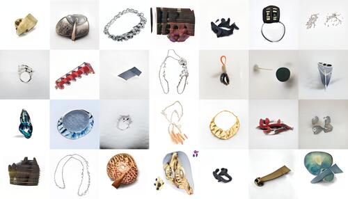 A: Het thema van co-creatie staat centraal in Artificial Intelligems, een fluïde collectief dat ik in 2020 samen met Greg Scheirlinckx, componist, sound engineer en datawetenschapper, oprichtte om het artistieke potentieel, maar ook de mogelijke risico’s, van machine learning binnen sieraden te onderzoeken. Door te werken met zelflerende algoritmen willen we onderzoeken of (en welke) nieuwe soorten en handelingen van ornament kunnen ontstaan binnen het fygitale domein om tot nieuwe expressies maar ook nieuwe manieren van creëren en beleven van sieraden te komen. Op die manier worden perspectieven rond mensgericht ontwerpen, materialiteit, waarde en auteurschap bevraagd, of dienen misschien meer dan ooit te worden bestendigd. We verkennen co-creatie met andere personen, artistiek werk, AI… Misschien maakt machine learning deze expansieve co-creaties mogelijk. Werken met beelden van het werk van andere kunstenaars als materiaal voor een nieuwe, collectieve creatie, stelt eigendom, agency en copyright ter discussie. Bovendien, AI ‘gebruiken’ als een tool is een heel andere opvatting en benadering dan 'samenwerken met' AI. Hoe denk je dat we deze processen van co-creatie verder zouden kunnen verdiepen?