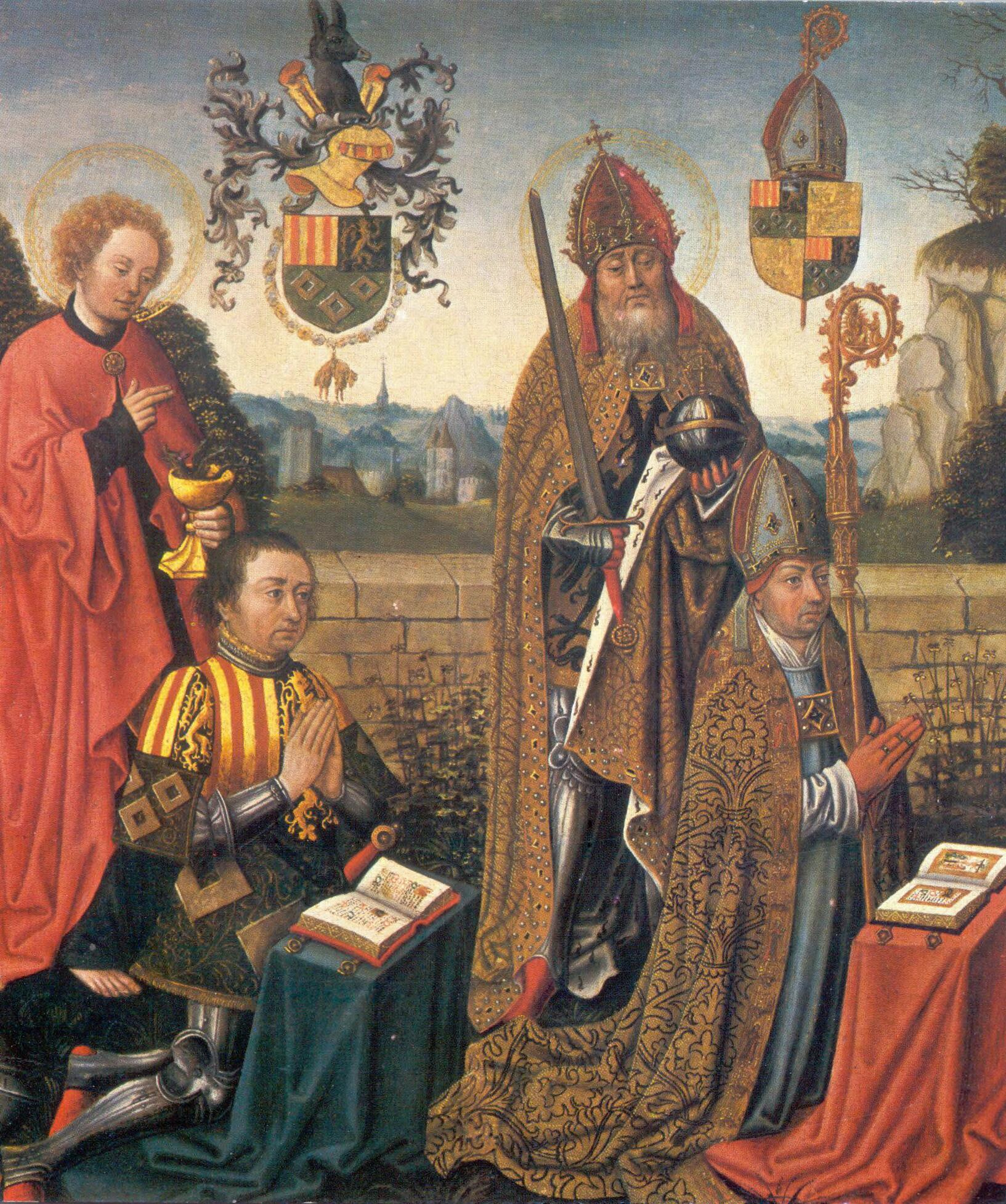 Hoofdafbeelding: Jan III van Glymes, zoon van Jan II, gekleed in een tabbard met het famliliewapen, en Hendrik van Bergen knieldend voor hun patroonheiligen. Paneel van een verloren gegaan huis- of reisaltaar, vervaardigd door een onbekende maker omstreeks 1480. (Bron: Markiezenhof)