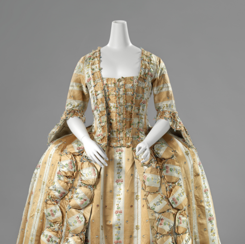 Dit is de enige japon in de collectie waarvan we met zekerheid kunnen zeggen dat het een positiejapon is. Sommige andere japonnen verdenken we er ook van er een te zijn, maar dit zijn dan vermaakte ‘gewone’ japonnen. Hierbij valt de extra ruimte bij de buik vaak pas op als de japon op de tafel van de restaurator nader wordt bekeken, of bij het aankleden op een pop.